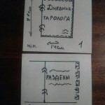 на чертежный лист А4 наклеиваю картинку карты, пишу ее название и варианты названий в разных колодах и языках, номер в колоде, её соответствие рунам, Книге перемен, зодиаку, планетам и т.д. — сюда пишу/рисую только названия и символы (обьяснения к названиям и символам складываю в раздел Перекресток). На обратную сторону пишу «книжные» значения этой карты. Если мало места, беру чистые канцелярские листы А4 (не чертежные — чертежный лист только первая страница с картинкой карты) и пишу на них. Потом по мере появления заметок прикладываю новые листы. Дыроколом сделаю дыры и вложу в A4 блокнот на кольцах.